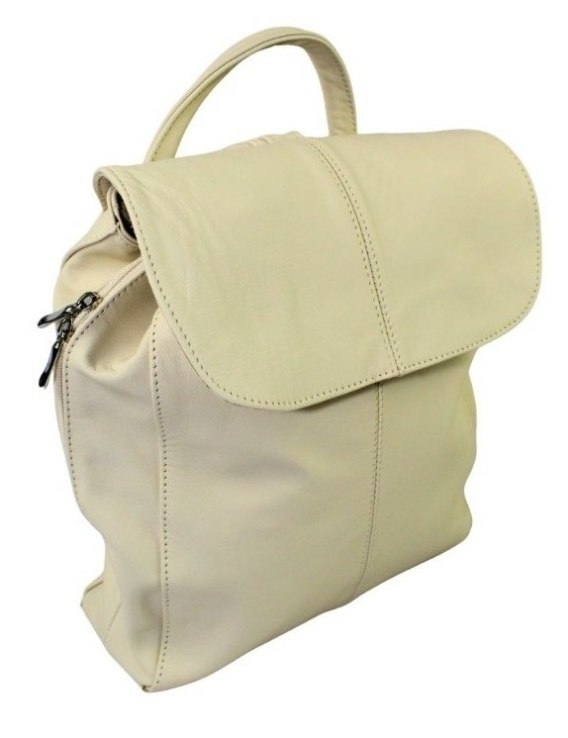 Kremowy plecak skórzany damski firmy MAGRE. Uszyty ze skóry naturalnej licowej, odznaczającej się miękkością i elastycznością oraz wytrzymałością w codziennym użytkowaniu. Model NATALIA spodoba się wielu paniom, a jego jasny subtelny kolor będzie się prezentował doskonale również z letnimi sukienkami. Szelki plecaka mają długość około 87 cm i można je połączyć wszytym suwakiem, tworząc jedną szeroką szelkę do zarzucenia na jedno ramię. Oprócz tego plecak można nosić również w ręku, dzięki wszyciu u góry plecaka mocnego ucha. Całość jest zapinana na klapkę i zamykana na bezpieczne dwa napy. Trzy komory plecaka pomieszczą różne przedmioty, a jedna z kieszeni zasuwana na zamek błyskawiczny ma wewnątrz dodatkową małą kieszonkę na telefon komórkowy oraz zapinany schowek na dokumenty lub klucze. Z tyłu, przy szelkach, znajduje się zamykany schowek o wymiarach 16 x 16 cm. Wymiary plecaka to: 32 x 33 x 10 cm.